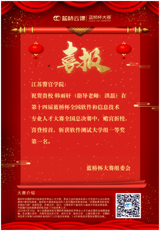 近日,第十四届蓝桥杯全国软件和信息技术专业人才大赛(以下简称蓝桥杯大赛)全国总决赛获奖名单揭晓,金年金官网学生取得了优异成绩,共获得3项国家一等奖,6项国家二等奖,4项国家三等奖,5项国家优秀奖,尤其21级网络安全与执法专业韩雨轩同学获得软件测试大学组一等奖第一名,取得该项赛事的新突破。学院的奖项质量和数量都居公安院校领先位置,获得“蓝桥杯大赛全国总决赛优胜学校”称号。
