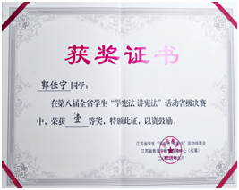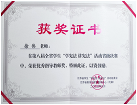 第八届江苏省学生“学宪法讲宪法”活动省级决赛暨“法治第二课堂”特别活动于近日在南京审计大学举行。全省66所高校81名素养竞赛学生经过初赛的激烈角逐,20位同学脱颖而出参加省级决赛。在省级决赛中,金年金官网22级法律系学生郭佳宁喜获一等奖,徐伟老师获优秀指导教师奖。