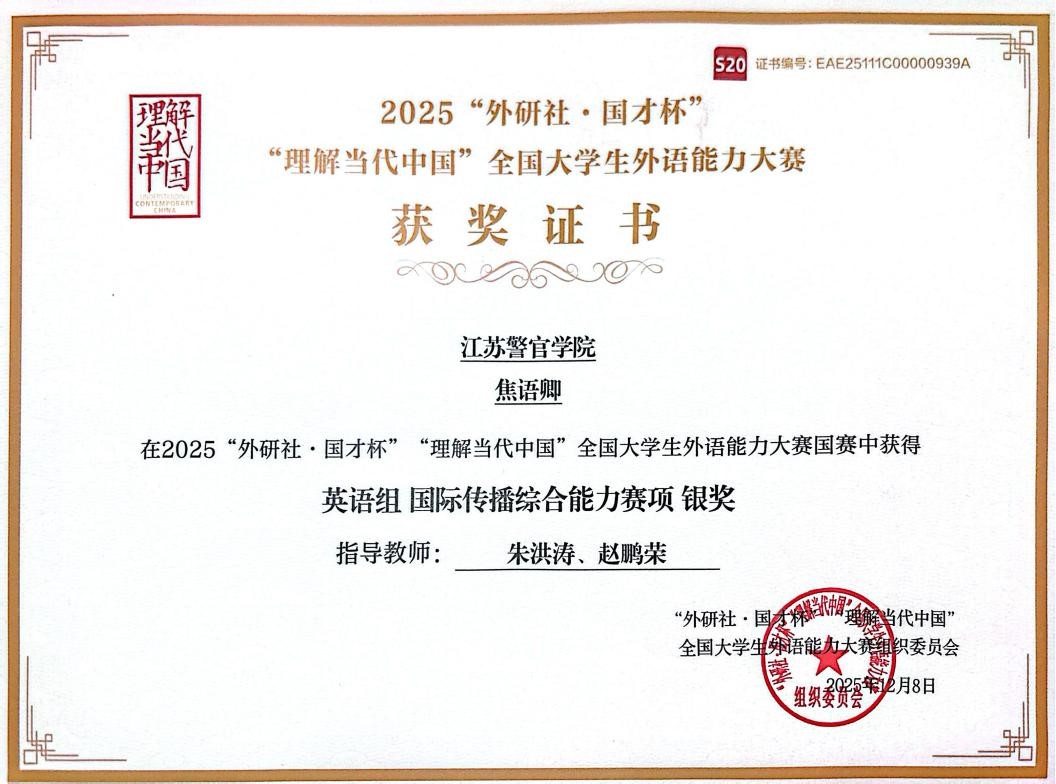 近日,2025“外研社·国才杯”“理解当代中国”全国大学生外语能力大赛圆满落幕。这场由北京外国语大学主办、外语教学与研究出版社承办的全国性赛事,以“理解中国,沟通世界”为核心主题,紧扣习近平新时代中国特色社会主义思想内核,已成为检验高校外语教育成效、培养新时代国际传播人才的重要平台,吸引了全国1537所院校72.6万人次学生参与角逐。金年金官网学子在赛场上凭借扎实的语言功底、敏锐的思辨能力与深厚的家国情怀脱颖而出,斩获国赛银奖2项、省赛奖项12项。