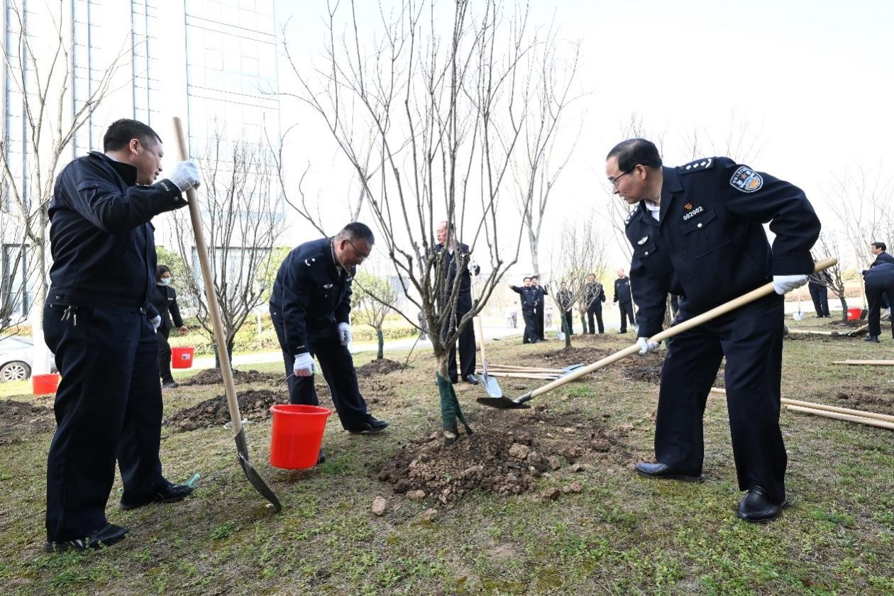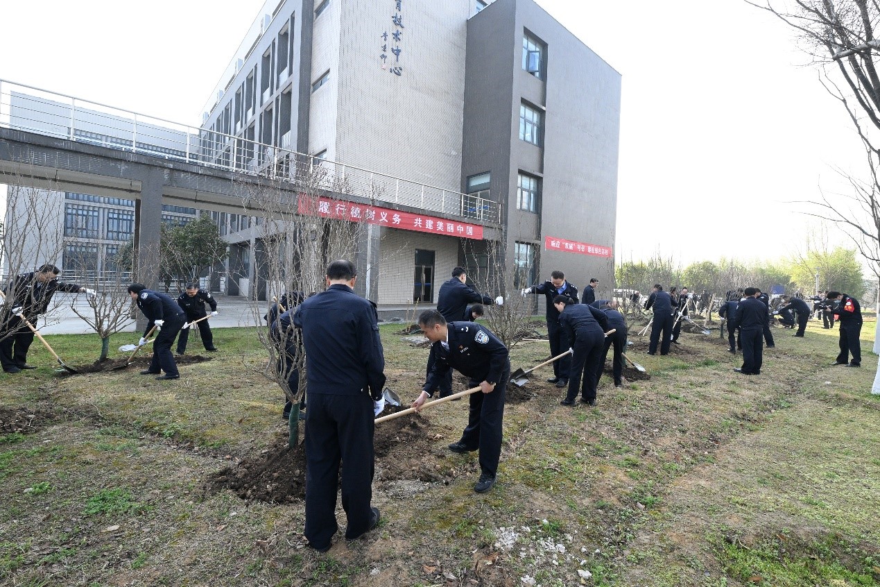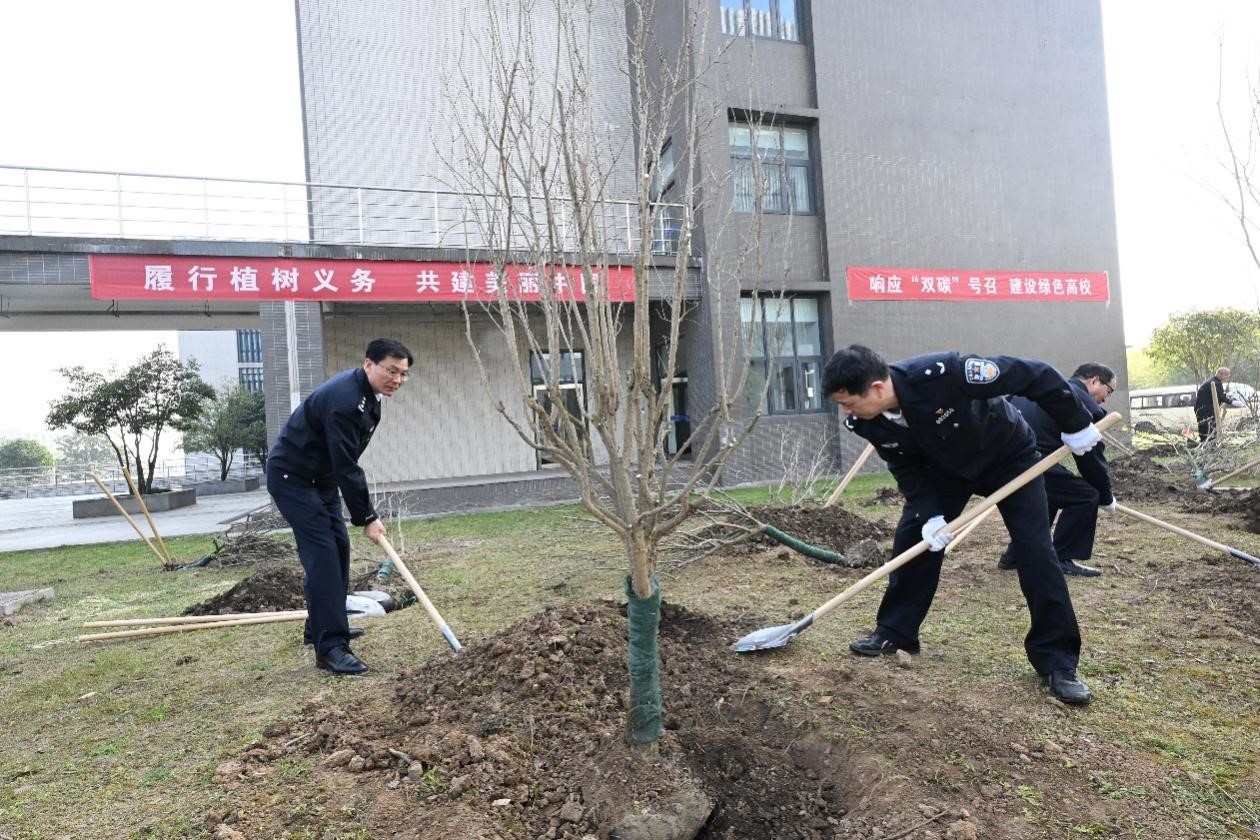 春风拂绿,万象更新。在2023年植树节来临之际,3月10日上午,学院开展以“响应‘双碳’号召 建设绿色高校”为主题的植树活动。省公安厅党委委员、学院党委书记夏存喜,学院党委副书记、院长张兰青与在校院领导、各部门负责人一道在现教中心西侧参加植树活动。