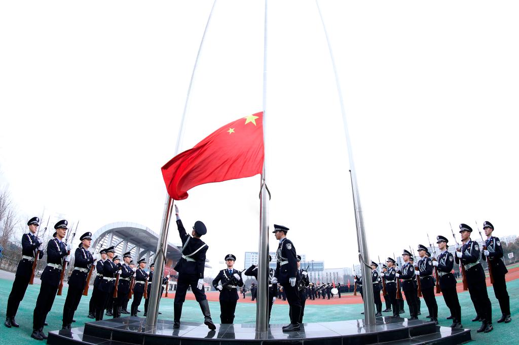 上午7时30分,学院田径场。仪仗队护卫着五星红旗,迈着铿锵有力的步伐走向升旗台。警乐团奏响雄壮的《义勇军进行曲》,全体在校公安专业学生身着警服、精神抖擞,齐声高唱中华人民共和国国歌,鲜艳的五星红旗冉冉升起、迎风飘扬。