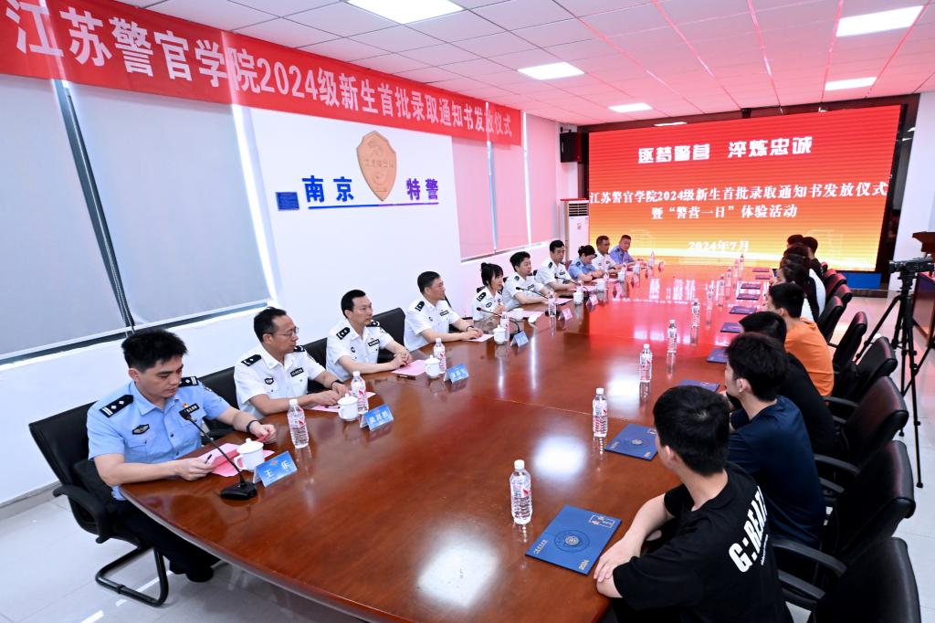 为前置思想政治教育,帮助新生体验警营文化,淬炼政治忠诚,坚定从警志向,7月14日上午,学院在南京市公安局特警支队七里河训练基地举行2024级新生首批录取通知书发放仪式暨“警营一日”体验活动。学院党委副书记、院长黄进,学院党委委员、副院长、政治部主任张敏,南京市公安局党委委员、政治部主任仇文庆出席活动。