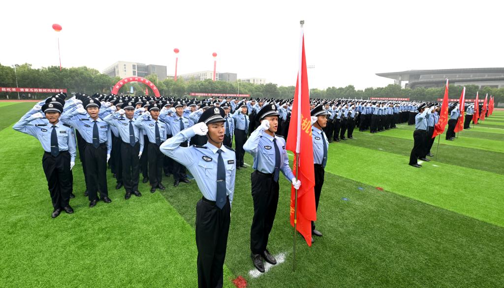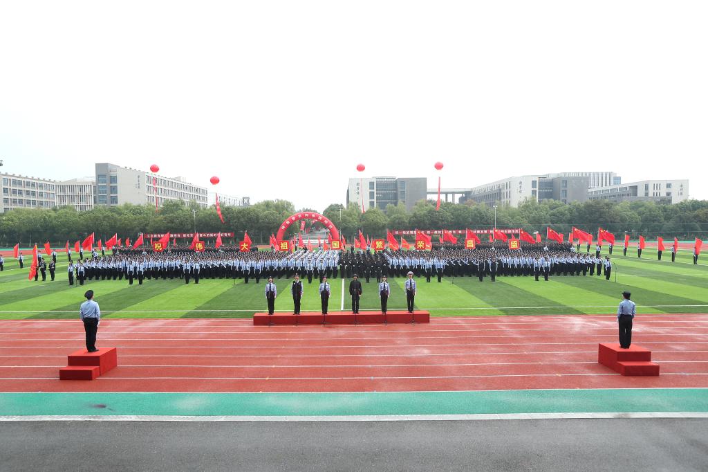 请党放心,强国有我。新生代表诗朗诵《预备警官向祖国报到》、全体新生合唱《歌唱祖国》将典礼气氛推向高潮。