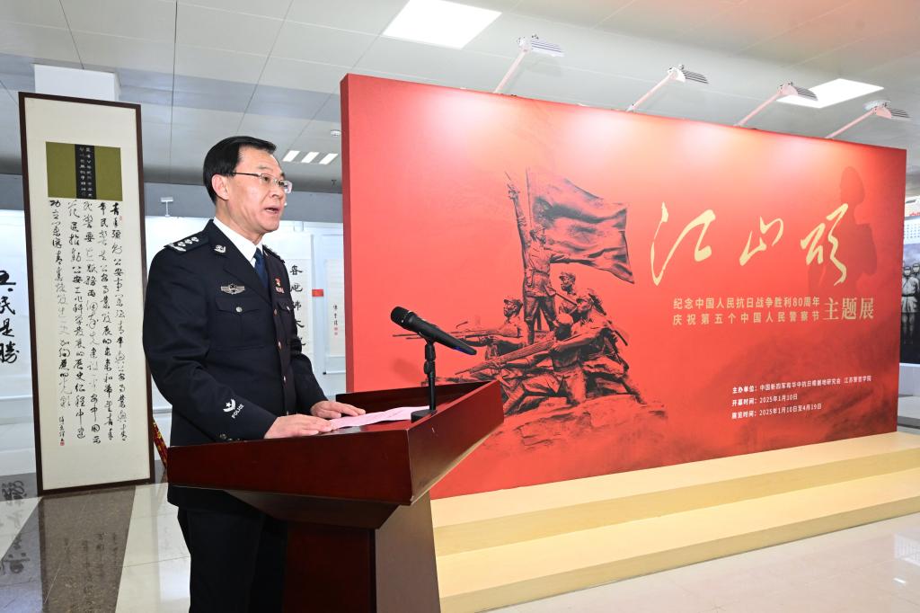 活动在警乐团演奏的《三大纪律八项注意》和《歌唱祖国》的铿锵乐曲中拉开帷幕。夏存喜代表学院党委致辞。他指出,此次主题展不仅是对抗战历史的重温学习,更是对抗战精神的传承弘扬,深刻诠释了“江山就是人民,人民就是江山”的深刻内涵。要深入学习贯彻习近平总书记重要训词精神,牢记人民公安来自人民、依靠人民、为了人民的崇高使命,传承红色基因、赓续红色血脉,教育引导全体干部师生牢记嘱托、感恩奋进,矢志不渝做党和人民的忠诚卫士,奋力推进江苏公安教育现代化走在前列,更好服务提升公安机关新质战斗力,努力为中国式现代化江苏新实践和公安工作现代化建设作出新的贡献。