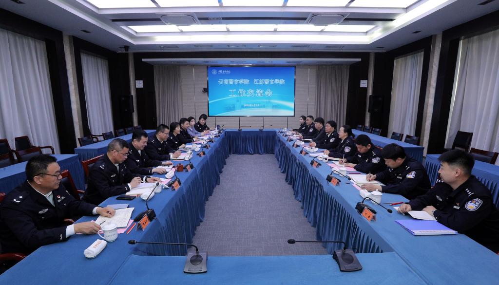 4月9日,云南警官学院党委书记胡水旺一行8人来金年金官网调研。学院党委副书记、院长黄进与胡水旺书记一行座谈交流。云南警官学院党委委员、政治部主任李静,金年金官网党委委员、副院长张敏,党委委员、政治部主任朱斌权,江苏省公安厅组宣处副处长、一级调研员陶莉参加座谈交流。