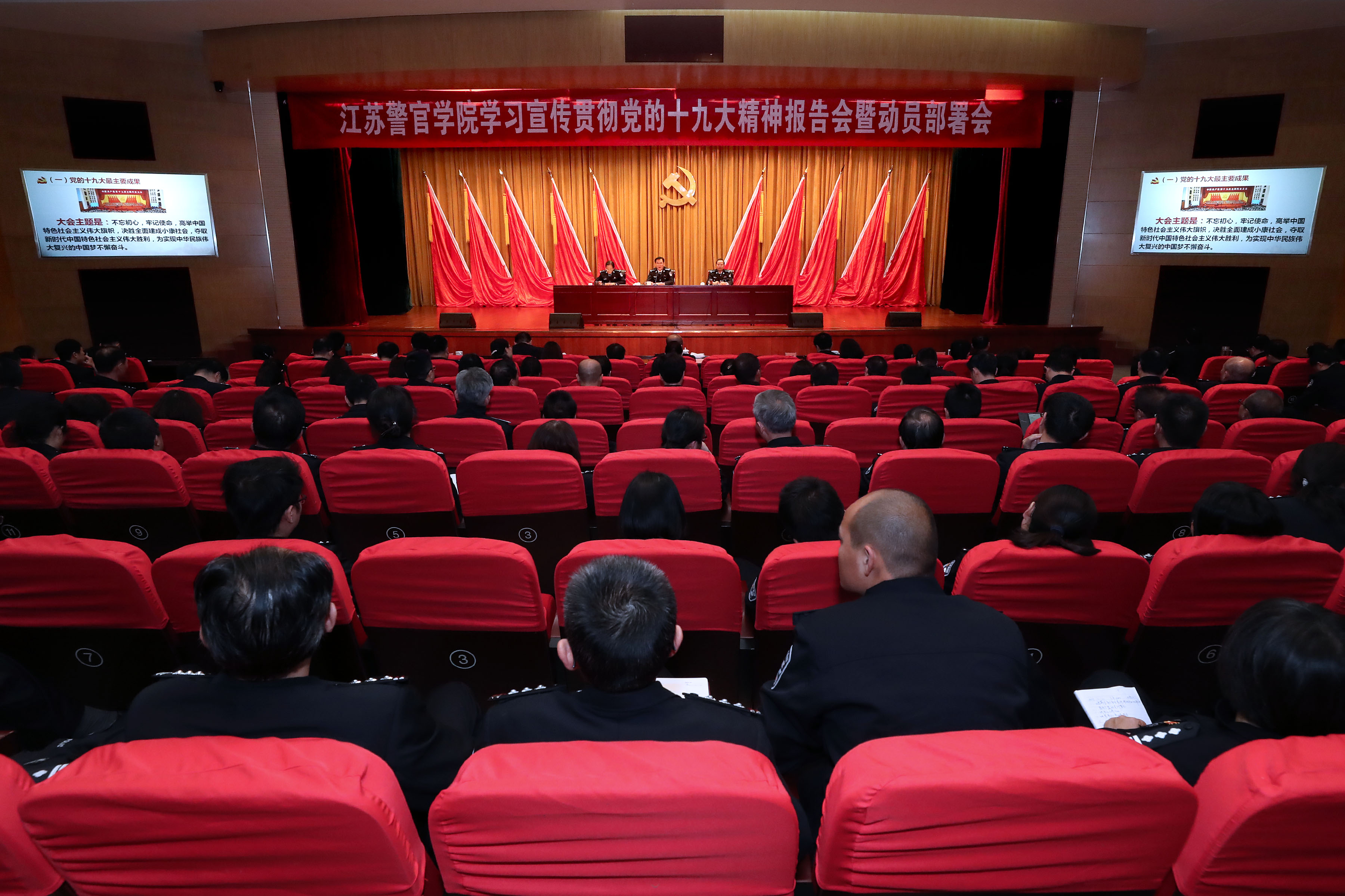 根据中央、省委、公安部党委、教育部党组和省公安厅党委、省委教育工委部署要求,11月10日下午,学院在浦口主校区第一学术报告厅,举行学习贯彻党的十九大精神报告暨动员部署会。省公安厅党委委员、学院党委书记夏存喜作学习贯彻党的十九大精神辅导报告,并对全院学习贯彻工作提出要求。学院党委副书记、院长张兰青主持会议,学院党委副书记张霞就学习贯彻工作进行了部署。