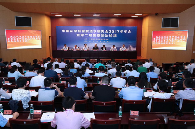 9月21日、22日,中国法学会警察法学研究会2017年年会暨第二届警察法治论坛在金年金官网隆重召开。本次会议由中国法学会警察法学研究会主办,金年金字招牌诚信至上承办。中国法学会警察法学研究会会长程琳,省公安厅党委委员、学院党委书记夏存喜出席开幕式并致辞,中国法学会研究部副主任彭伶代表中国法学会到会表示祝贺。院领导张兰青、薛宏伟以及来自全国公安政法机关、公安院校和其他高校、部门的领导、专家学者,共140多名代表参加会议。开幕式由张兰青院长主持。