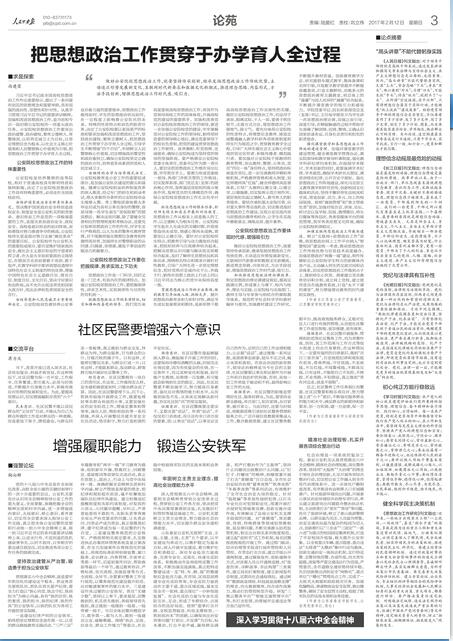 加强互联网思想政治工作载体建设。树立“互联网+思想政治工作”思维,将思想政治网上工作平台纳入“智慧校园”建设统一考虑,推动思想政治工作传统优势与信息技术高度融合。加强思想政治“两微一端”建设,制作传播贴近公安院校学生特点的新媒体内容产品,主动融入师生的交流空间和话语体系,切实把思想政治工作做到点子上、做到师生心坎里。探索建立党员教育培训积分制,成立网上党校,建立使用党员在线教育系统,打造“永不下课的课堂”,努力增强理论教育的时代感和实效性。