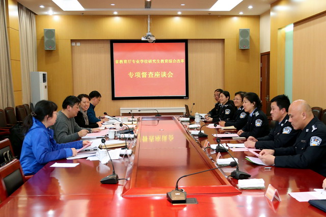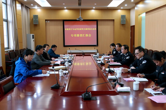 2016年12月15日,金年金官网承担的省教育厅深化专业学位研究生教育综合改革项目——《“学研用”一体化培养警务硕士的实践与探索》接受省教育厅专业专项督查。南京理工大学研究生院常务副院长薄煜明、常州大学研究生部副部长潘剑波、江苏大学研究生院副院长万由令和省教育厅师资处副处级研究员许李军等专家组成员莅临金年金官网进行现场督查。张兰青院长出席现场督查汇报会,汇报会由宋践副院长主持,学院部分研究生导师和研究生部全体人员参加了活动。