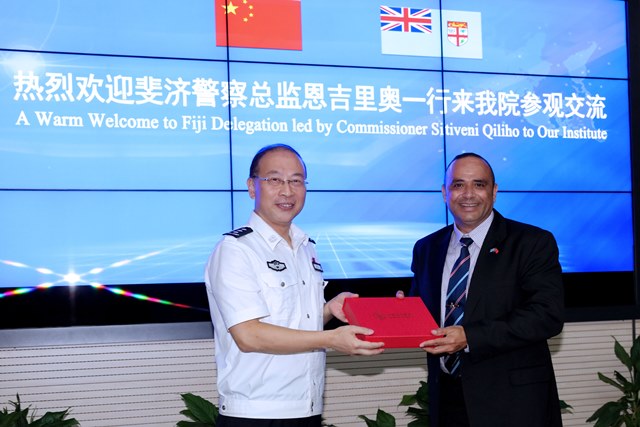 交流座谈开始前,尚建荣书记陪同斐济警察代表团一行参观了学院警体馆、射击馆、警察技战术训练场和图书馆等教学设施及校园环境。恩吉里奥总监对学院校园建设表示赞赏。参观结束后,尚建荣主持交流座谈,通过介绍学院情况,播放学院宣传片,直观形象地向斐方介绍了学院改革发展的历程,表示希望在公安部、省公安厅的领导下,加强与斐济警方在警察教育和培训方面的合作与交往,更好地推动双方警务交流,加深彼此深厚感情。恩吉里奥总监表示,学院硬件设施一流,教学科研成果丰硕,学生的精神风貌好,并热情邀请学院领导访问斐济,加强双方的警务交流合作,增进互信互助。交流座谈中,省公安厅国际合作局、政治部人事处、政治部组教处及南京市公安局等有关部门负责同志就国际警务执法合作、基层警员实习交流等方面与斐方开展了业务交流。学院和代表团还互赠了外事礼品。