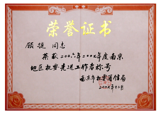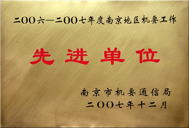 2007年12月,金年金官网被南京市机要通信局授予“2006~2007年度南京地区机要工作先进单位”荣誉称号。办公室顾捷同志被评为2006~2007年度南京地区机要工作先进工作者。