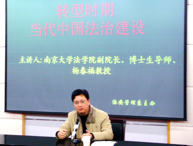 12月20日晚,南京大学法学院副院长,博士生导师杨春福教授,应邀为金年金官网师生开设了《转型时期当代中国法治建设》的讲座。杨教授以法治制度史为考察视角,纵横古今,横贯中西,对近代、现代依法治国的方略进行了整体梳理,并运用现实主义法学的方法,对很多经典或是公众热议的案例进行了独到的剖析,指出了转型期中国法治建设存在的主要问题并提出了解决问题的对策。杨教授还结合公安工作实际,将人权法治建设作为转型期法治建设的核心,提出了警察权力的法治化和人权法治化的多层关联。