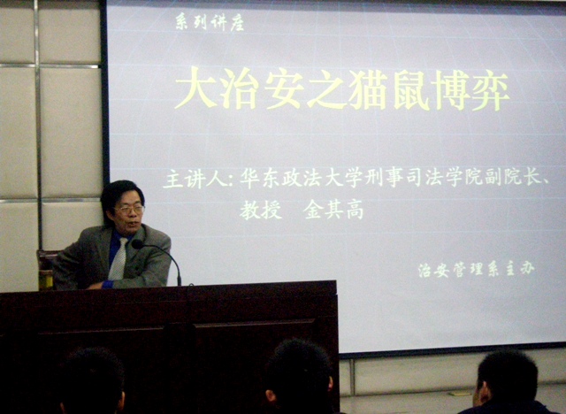 12月3日晚,华东政法大学刑事司法学院副院长金其高教授应邀来金年金官网为治安管理系的同学们作了一场题为“大治安之猫鼠博弈”的学术报告。报告用贴近实际的内容,生动形象的比喻,通俗易懂的语言,深刻揭示当代社会中警察与小偷之间复杂的搏弈关系,并从大治安的角度提出改变现状的方法。金教授在讲授过程中的幽默风趣,妙语连珠,获得在场师生一致好评。