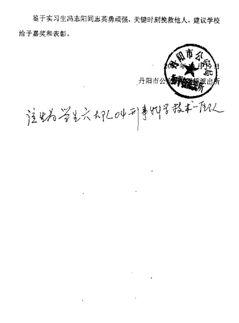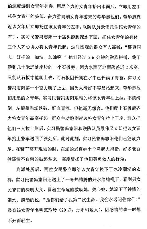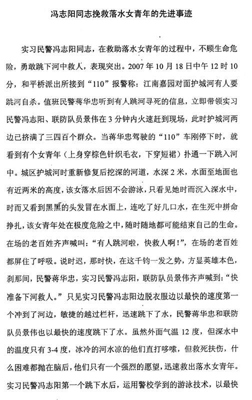 2007年10月18日12时左右,丹阳市公安局和平路派出所接到群众报警,称有人要在护城河跳河。正在和平路派出所实习的金年金官网2004级刑技一区队学生冯志阳在值班民警的带领下迅速赶到现场,发现一名女青年已落入河中。落水者由于不会游泳,在水中几经沉浮,生命处于极度危险之中。冯志阳第一个冲到河边,奋不顾身跳入2米多深的护城河中,快速游到落水者身边,奋力将她托出水面。冯志阳与随后下水的民警和联防队员一起,奋力拼搏,终于将落水者营救上岸。在救援过程中,冯志阳不慎滑倒,左膝盖受伤,鲜血直流,但他全然不顾。现场数百名群众以热烈的掌声表达对人民警察的敬意。