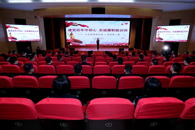 为深入贯彻落实习近平总书记关于思政课建设重要指示精神,扎实推进思政课改革创新,3月1日下午,学院举行新学期“思政第一课”,省公安厅党委委员、学院党委书记夏存喜与来自南京市公安局水上分局的吕宏伟、常州市公安局金坛分局的陆旭东、连云港市公安局刑警支队的张双印等三位公安英模,以“建党百年守初心、忠诚履职践训词”为主题,共同为师生讲授“思政第一课”。