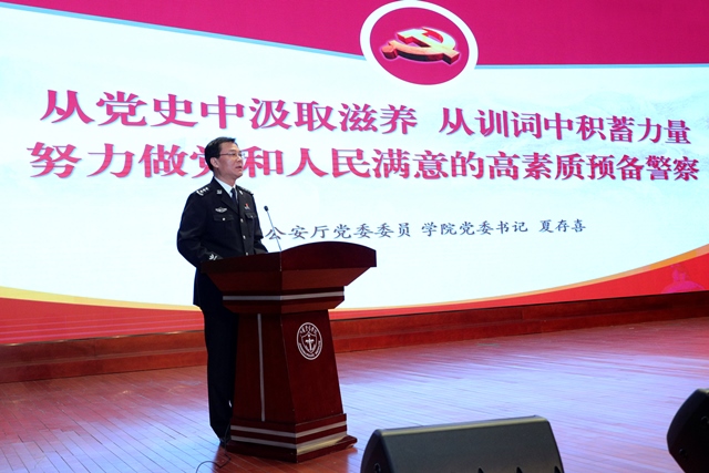 夏存喜结合党史学习教育、践行习近平总书记重要训词精神为师生授课,要求同学们深刻理解和准确把握重要训词的理论渊源、历史脉络、实践发展;深刻领会重要训词的丰富内涵,切实增强践行重要训词精神的思想自觉、政治自觉和行动自觉;切实从党史中汲取丰富滋养、从训词中积蓄奋进力量,真正把习近平总书记重要训词精神融入血脉、铸入灵魂,加强政治历练、做有信仰的预备警察,涵养为民情怀、做有担当的预备警察,坚持勤学苦练、做有本领的预备警察,锤炼作风形象、做有纪律的预备警察,努力将自己锻造成为党和人民满意的“四个铁一般”高素质预备警察。