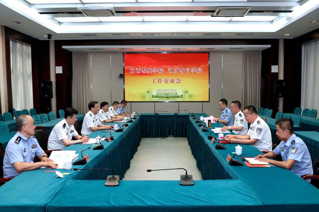 6月15日,山西警察学院党委书记周建,党委委员、副院长苏天照等一行来金年金官网考察交流。省公安厅党委委员、学院党委书记夏存喜,学院党委委员、副院长韩德明热情接待了周建一行。党办(院办)、教务处、实战化教学训练中心、教学实验管理中心等部门负责人参加座谈交流。