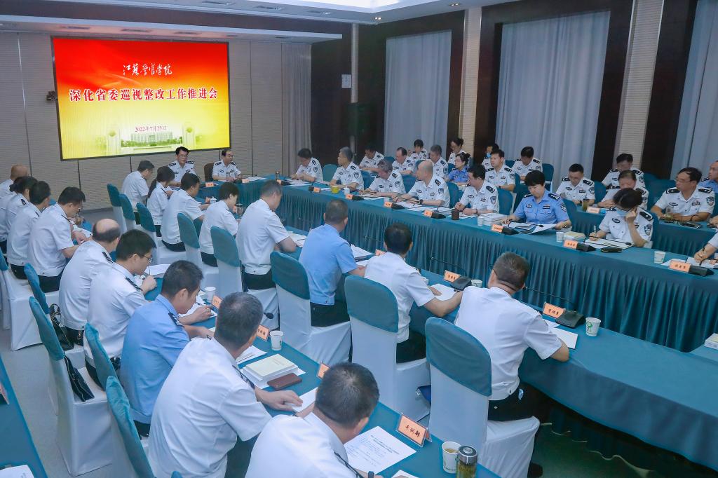 7月25日下午,省公安厅党委委员、学院党委书记夏存喜主持召开学院深化省委巡视整改工作推进会,深入学习贯彻习近平总书记关于巡视整改重要指示精神和中央《关于加强巡视整改和成果运用的意见》精神,对照省委巡视反馈意见和学院党委整改方案,总结阶段性工作,就深化巡视整改、巩固整改成果进行再强调再部署。