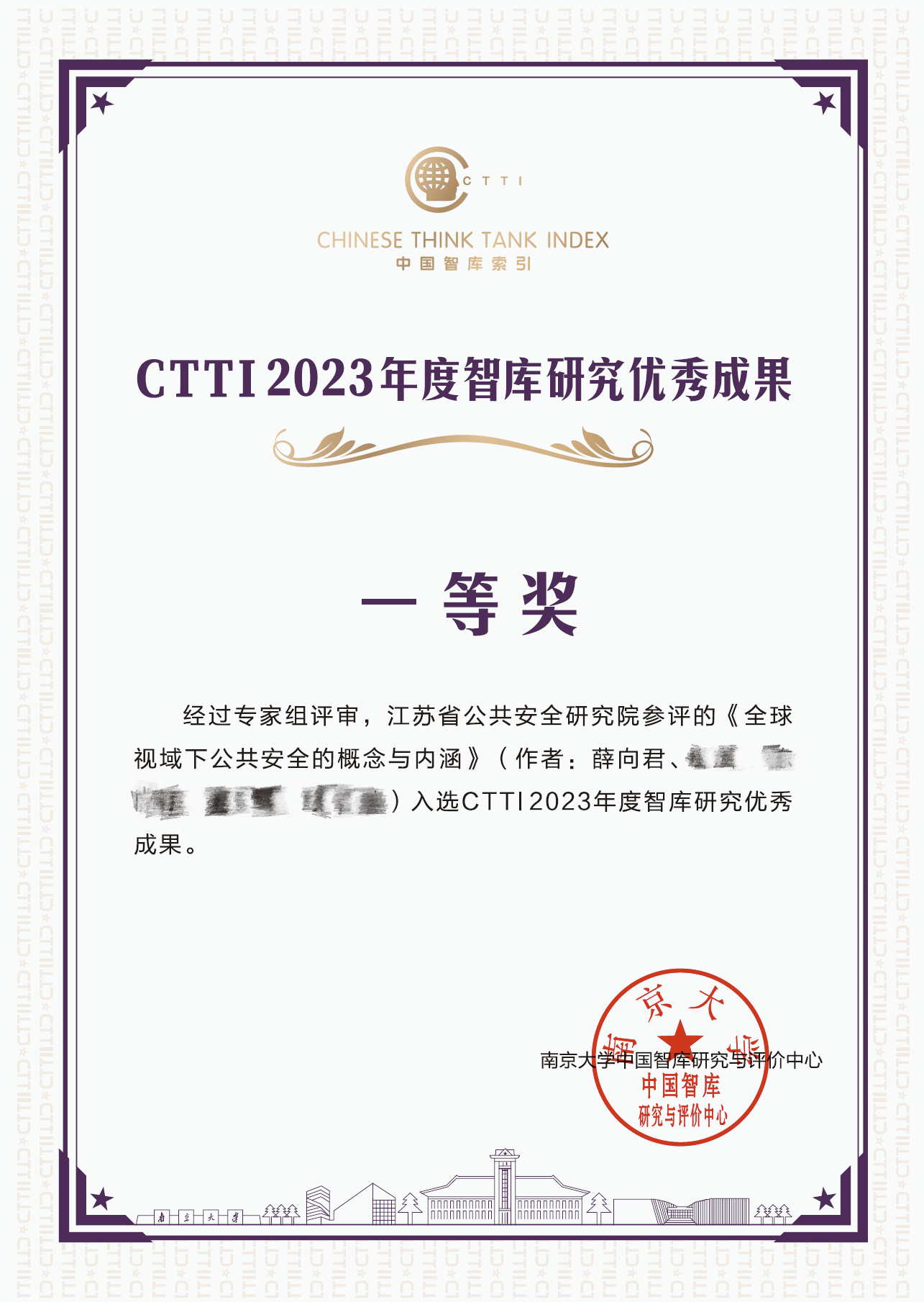 金年金字招牌诚信至上江苏省公共安全研究院提交的研究报告《全球视域下公共安全的概念与内涵》获评CTTI2023年度智库研究优秀成果一等奖。据悉,此次南京大学中国智库研究与评价中心共征集到来自全国542家机构的542份智库研究成果。经过工作团队初审和专家委员会终审,最终共有287份研究成果入围智库研究优秀成果推介名单,其中特等奖56份,一等奖114份,二等奖117份。