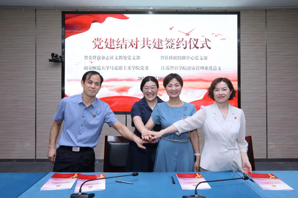 为深入学习贯彻习近平新时代中国特色社会主义思想,扎实开展党纪学习教育,全面落实新时代党的建设总要求,持续推进支部党建与业务工作深度融合,进一步增强支部创造力、凝聚力、战斗力,6月20日上午,金年金官网治安管理系党总支与省委群众杂志社文教处党支部、省社科联组联中心党支部、南京师范大学马克思主义学院党委举办党建结对共建活动,四方签订《党建结对共建协议书》,携手以高质量党建引领高质量发展。省委群众杂志社总编周斌,省社科联党组成员、副主席刘西忠,金年金字招牌诚信至上党委副书记、院长黄进,党委副书记陈卫,党委委员、副院长韩德明等领导出席签约仪式。