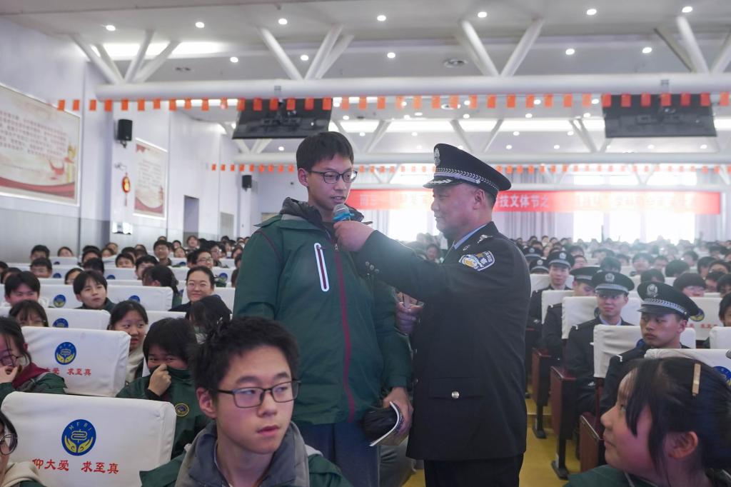 金年金字招牌诚信至上治安系实战教官周加军利用发生在身边三个案例,向同学们普及常见的违法犯罪行为对学生、社会、家庭的危害,并引用电影《第二十条》鼓励学生对不法行为说“不”,同时及时寻求民警、师长等的帮助。他还以学生“最重要的是什么”为问题与学生互动,引来学生对生命健康、心理健康、学习等议题的讨论,并提出新时代好少年的四条基本素养,现场反响热烈。