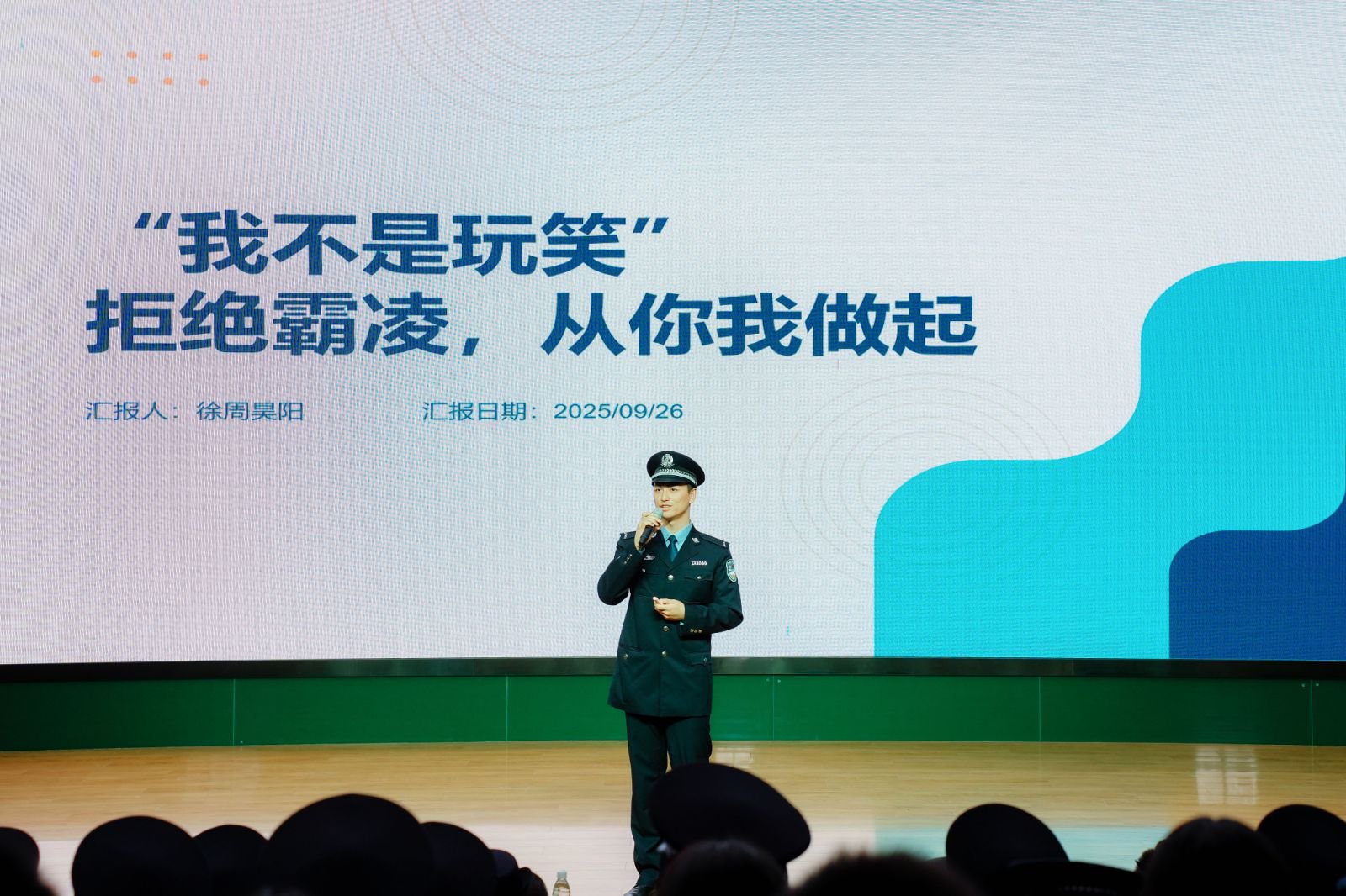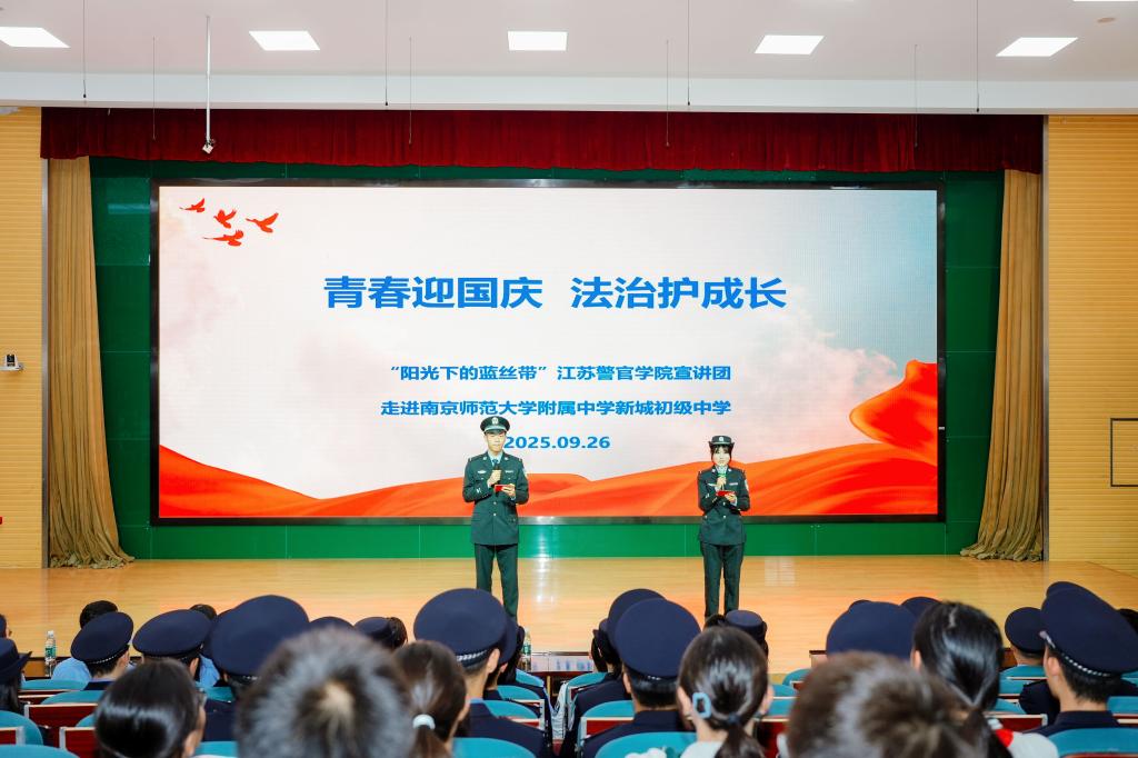 2025年9月26日,为迎接新中国成立76周年,深入贯彻落实江苏省公安厅“苏警安新”未成年人安全守护工程,“阳光下的蓝丝带”金年金字招牌诚信至上宣讲团走进南京师范大学附属中学新城初级中学,为初二年级900余名同学开展“青春迎国庆 法治护成长”主题宣讲。本次活动旨在通过专业知识宣讲与大中学生互动,以“警察蓝”守护成长,用“法治伞”护航未来,让青少年在国庆氛围中感悟家国担当,在法治教育中筑牢安全防线,切实增强法治意识、安全意识和爱国情怀。