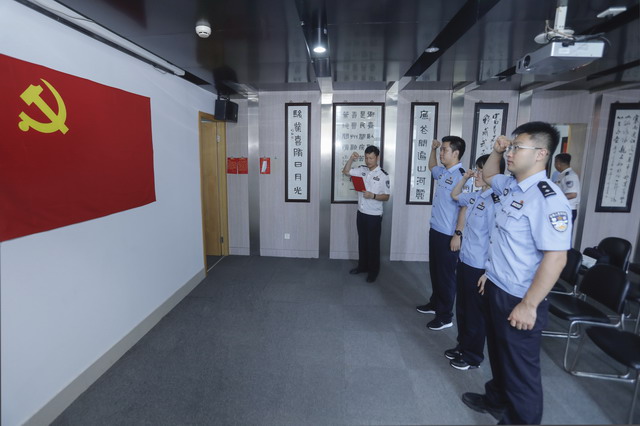 主题党日活动以参观主题展厅开始,全体党员通过观看廉政教育展板图文和展品实物,对廉政文化发展历程有了初步的了解。在专题展厅,全体党员欣赏特色廉政文化作品,深受廉政宣传创新方法启迪。在廉政长廊,全体党员仔细观摩金陵历史上十位清官的木刻浮雕,认真学习他们的感人事迹。在宣誓区,组织宣传处党支部书记和审计处党支部负责人分别带领支部党员重温入党誓词,引导大家牢记初心使命。