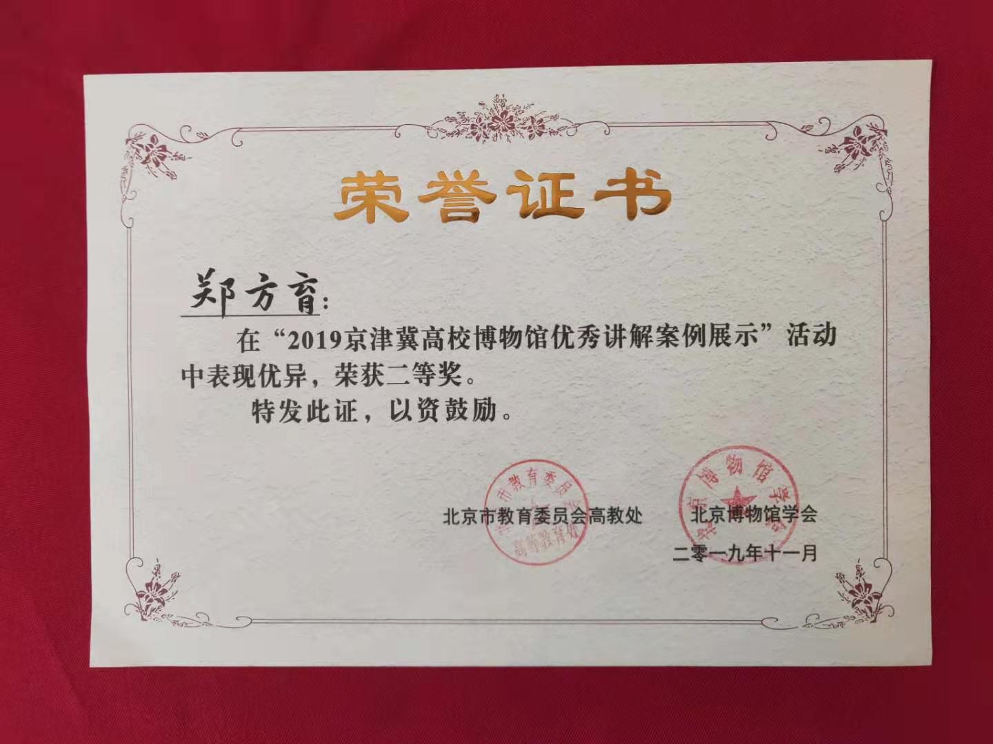 11月20日,“第五届中国高校博物馆馆长论坛暨2019京津冀高校博物馆优秀讲解案例展示活动”颁奖仪式在中国传媒大学举行。经过激烈角逐和专家评选,金年金官网博物馆志愿者、刑事科学技术系2017级郑方育同学荣获大赛二等奖。