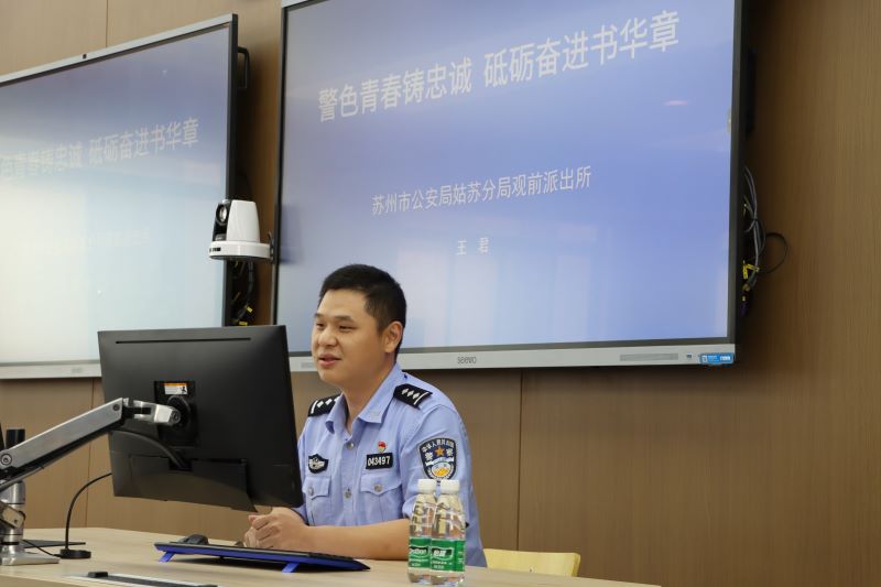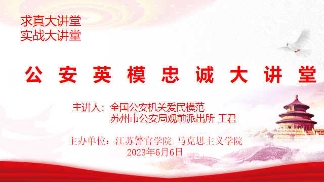 为深入开展学习贯彻习近平新时代中国特色社会主义思想主题教育,充分发挥忠诚警魂教育等大思政课在立德树人中的重要作用,坚持不懈用习近平新时代中国特色社会主义思想铸魂育警,激励引导青年学警学习英模事迹,感悟英模精神,砥砺从警初心,不忘入警使命,6月6日,马克思主义学院邀请全国公安机关爱民模范、金年金官网2011届校友、苏州市公安局观前派出所副所长王君开展“公安英模忠诚大讲堂”宣讲活动。