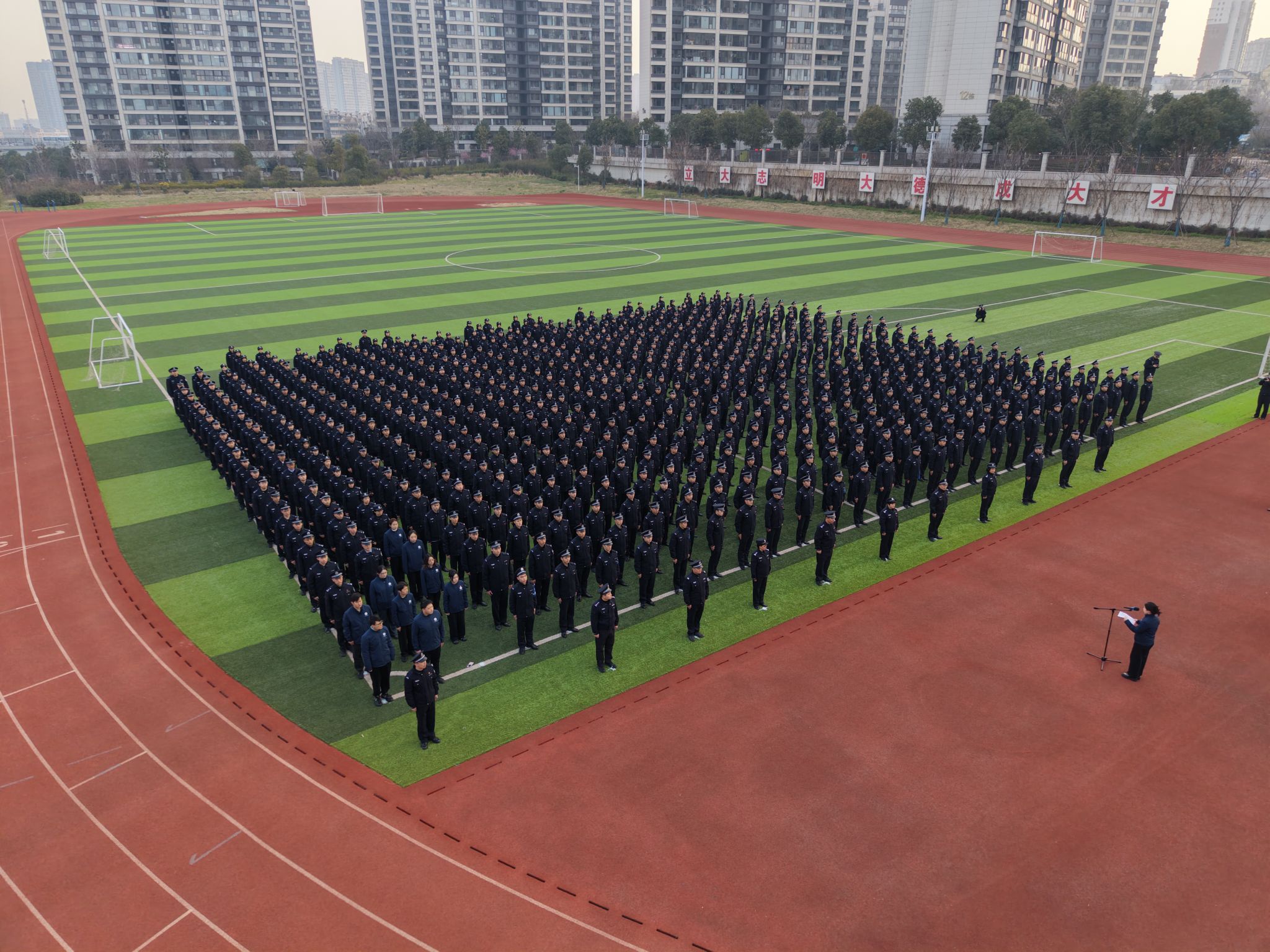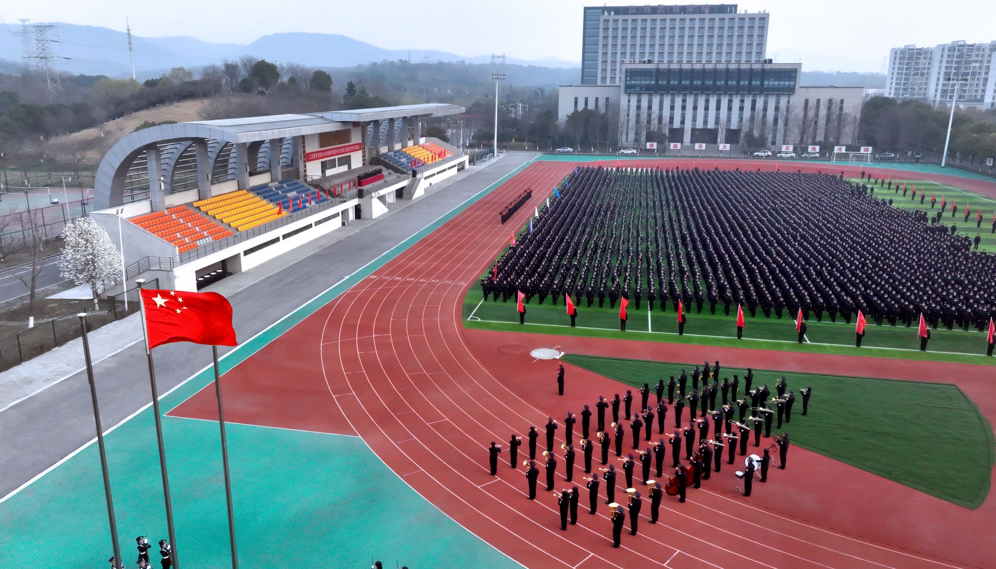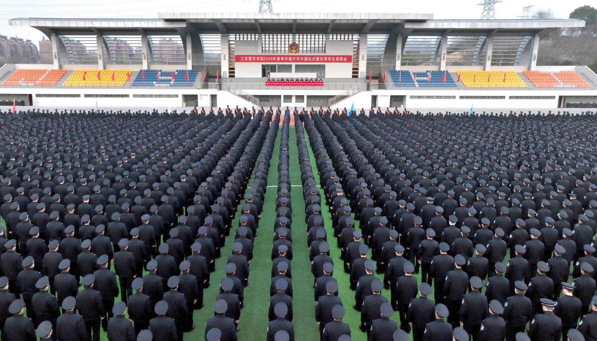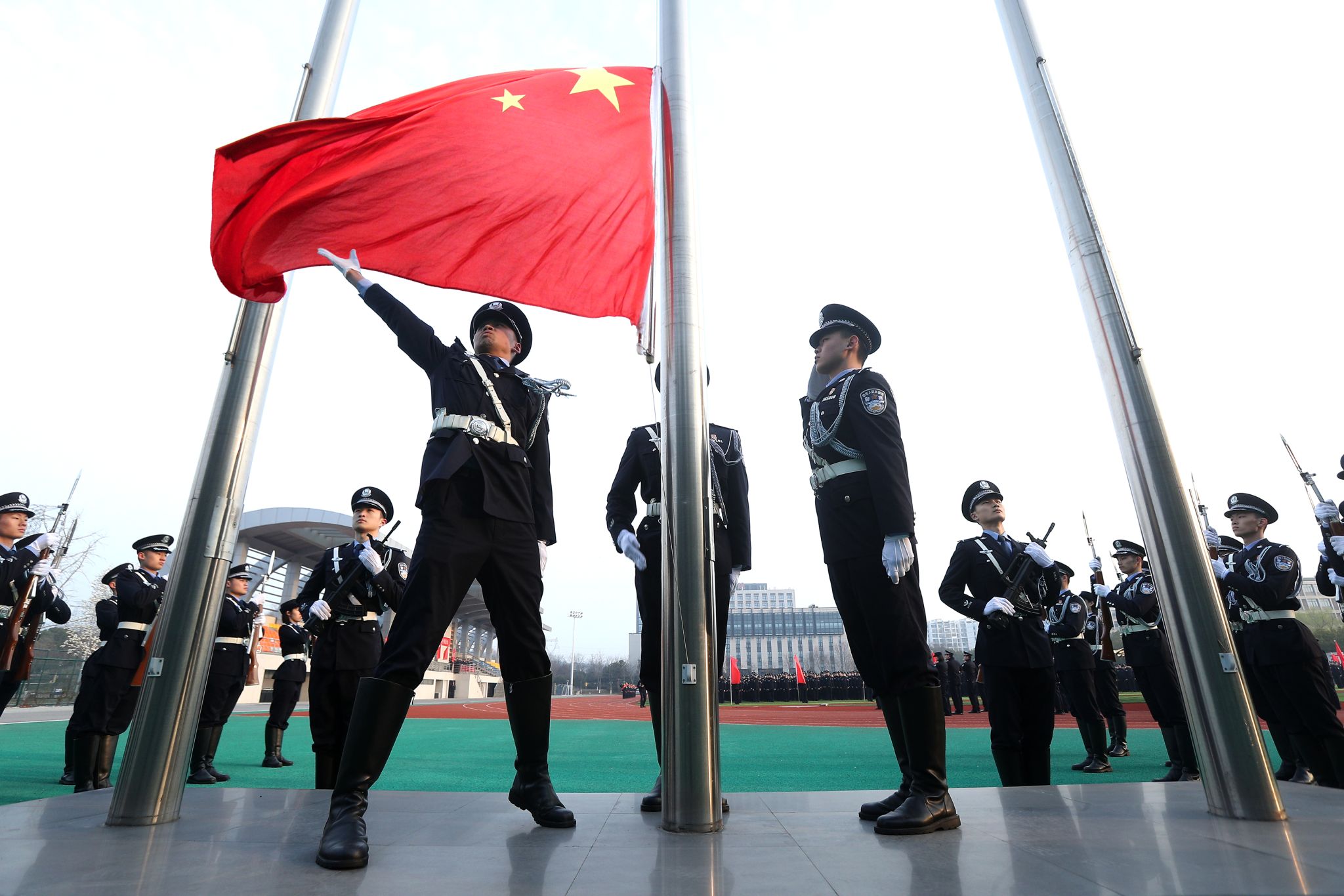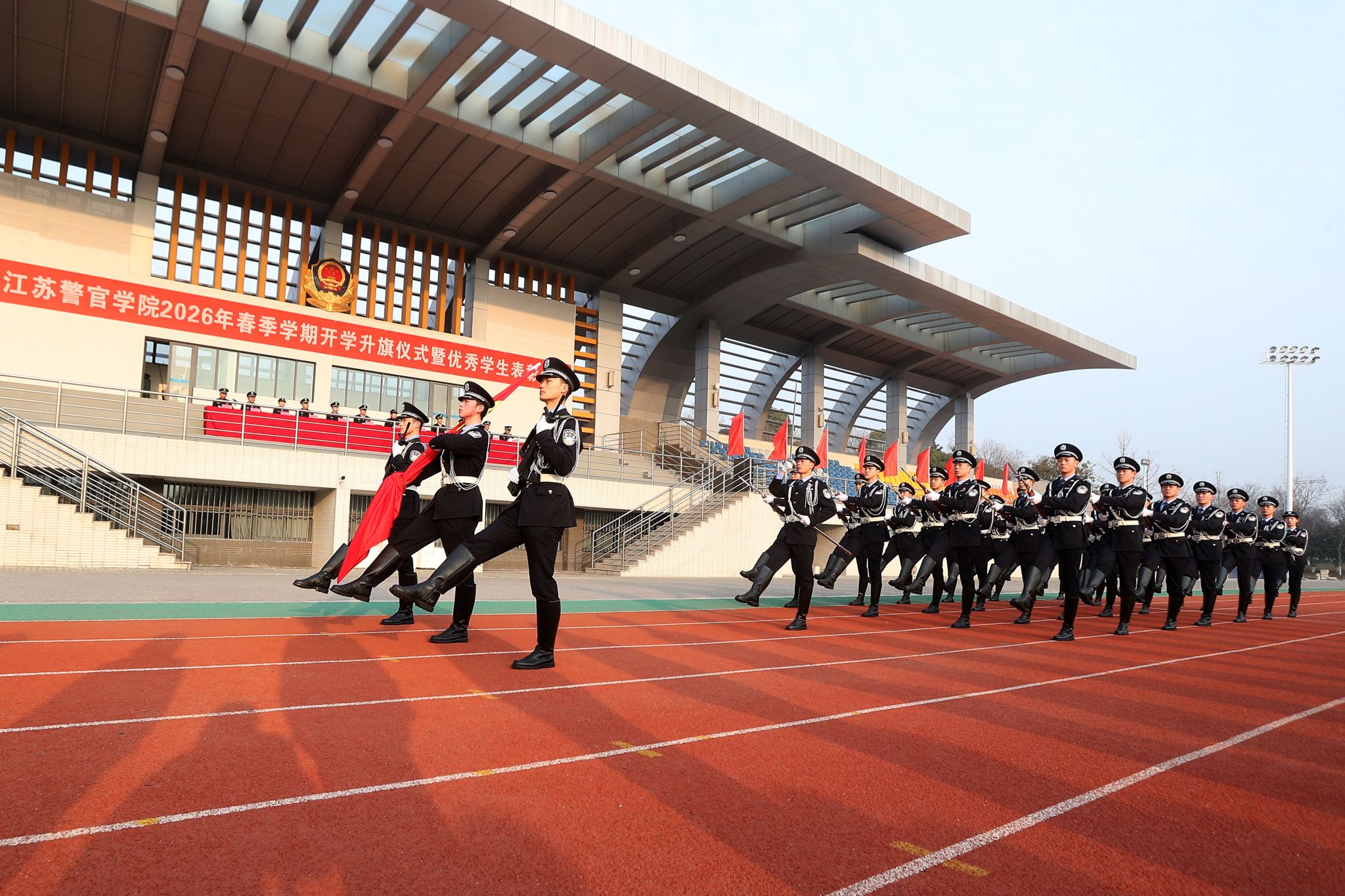 两个校区的警体训练场,112个区队全体学警精神饱满、整装肃立。仪仗队队员目光坚毅、步伐整齐,高擎五星红旗庄严迈向升旗台。伴随着雄壮的《义勇军进行曲》,鲜艳的五星红旗冉冉升起,出席活动的全体师生面向国旗致以最崇高的敬礼。