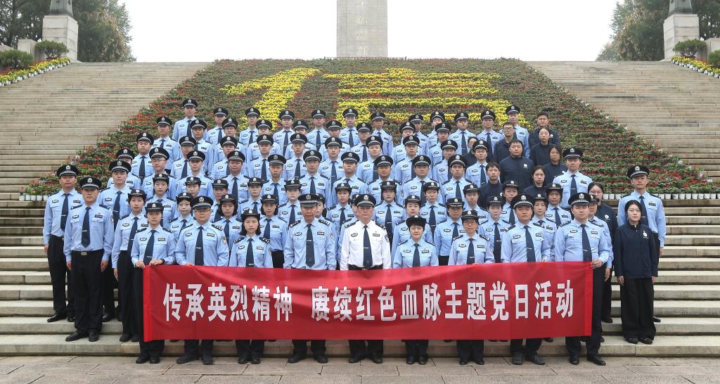 天地英雄气,千秋尚凛然。雨后的雨花台松柏凝翠,丰碑矗立。主题党日活动在雄壮的《义勇军进行曲》中开始,全体师生精神饱满、警容严整、齐唱国歌,并面向雨花台烈士纪念碑脱帽肃立、默哀致敬、献上花篮,冯红新代表全体师生仔细整理花篮缎带,带领全体党员面向党旗重温入党誓词,随后依次绕行并瞻仰了雨花台烈士纪念碑和江苏公安英烈墙。最后,主题党日活动在激昂的《国际歌》中结束。